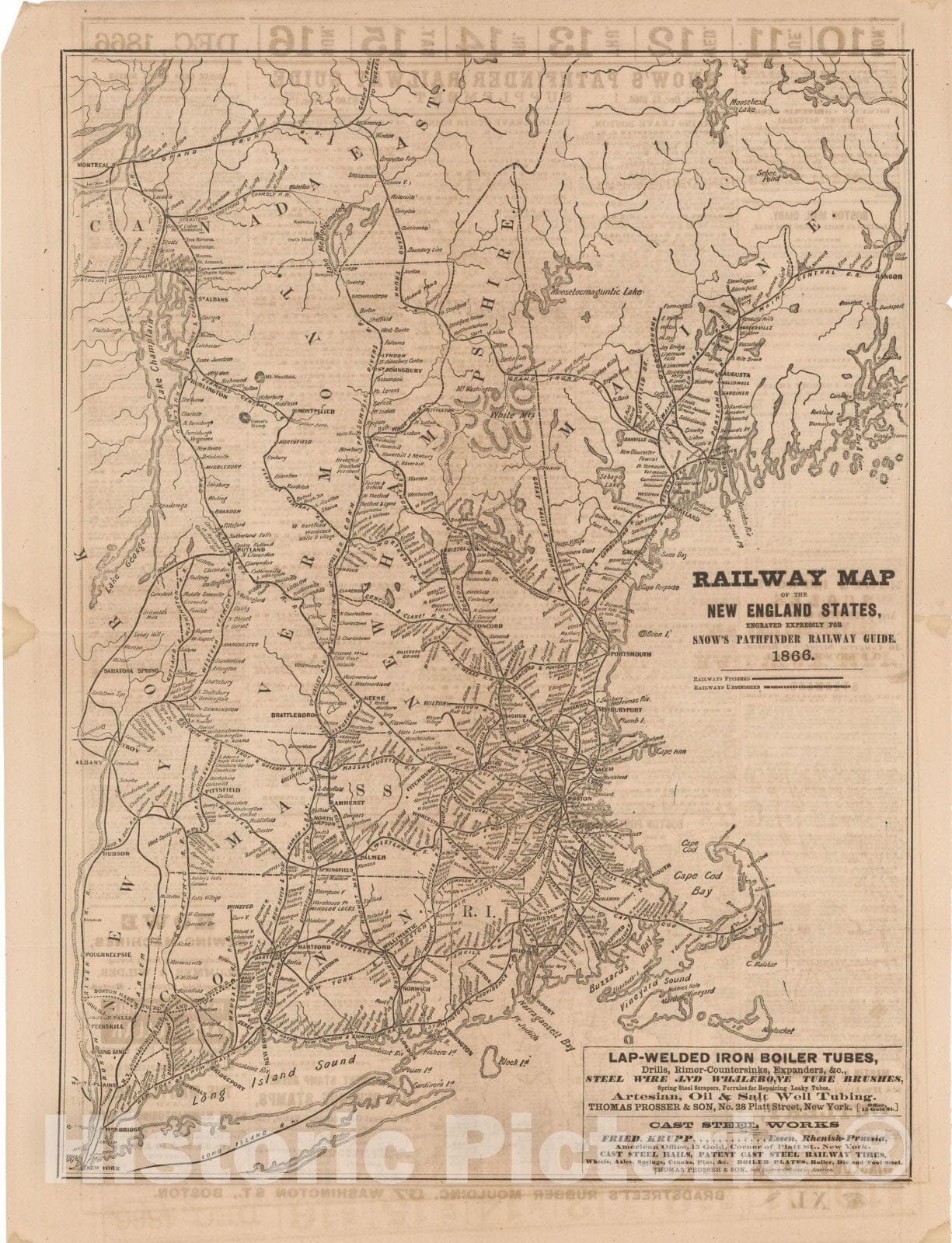 Historic Map : Snow's Railway Map of the New England States 1866 Transit Railroad Catography , Vintage Wall Art