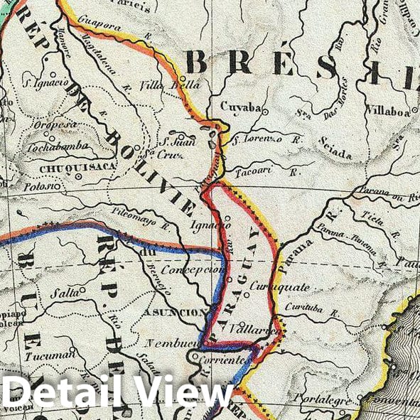 An uncommon and extremely attractive 1852 map of South America. Covers the entire continent from the Caribbean Sea to Tierra del Fuego. It shows the Republic of New Granada, ecuador, Venezuela, British, Dutch and French Guyana, Brazil, Peru, Bolivia, Chile, Patagonia, Republic of La Plata (Argentina) and Buenos Aires and the Falkland Islands. Throughout, the map identifies various cities, towns, rivers and assortment of additional topographical details. Much of South America was, at this time, embroiled in or about to become embroiled in, severe civil strife. The new nations, freed from Spanish dominance though various wars of liberation in the previous decades, were struggling with their newfound independence in an attempt create stable and prosperous governments. Most dissolved into civil war between 1858 and 1864. The map features a beautiful frame style border. Prepared by J. G. Barbie du Bocage for publication as plate no. 33 in Maison Basset's 1852 edition of Atlas Illustre Destine a l'enseignement de la Geographie elementaire.