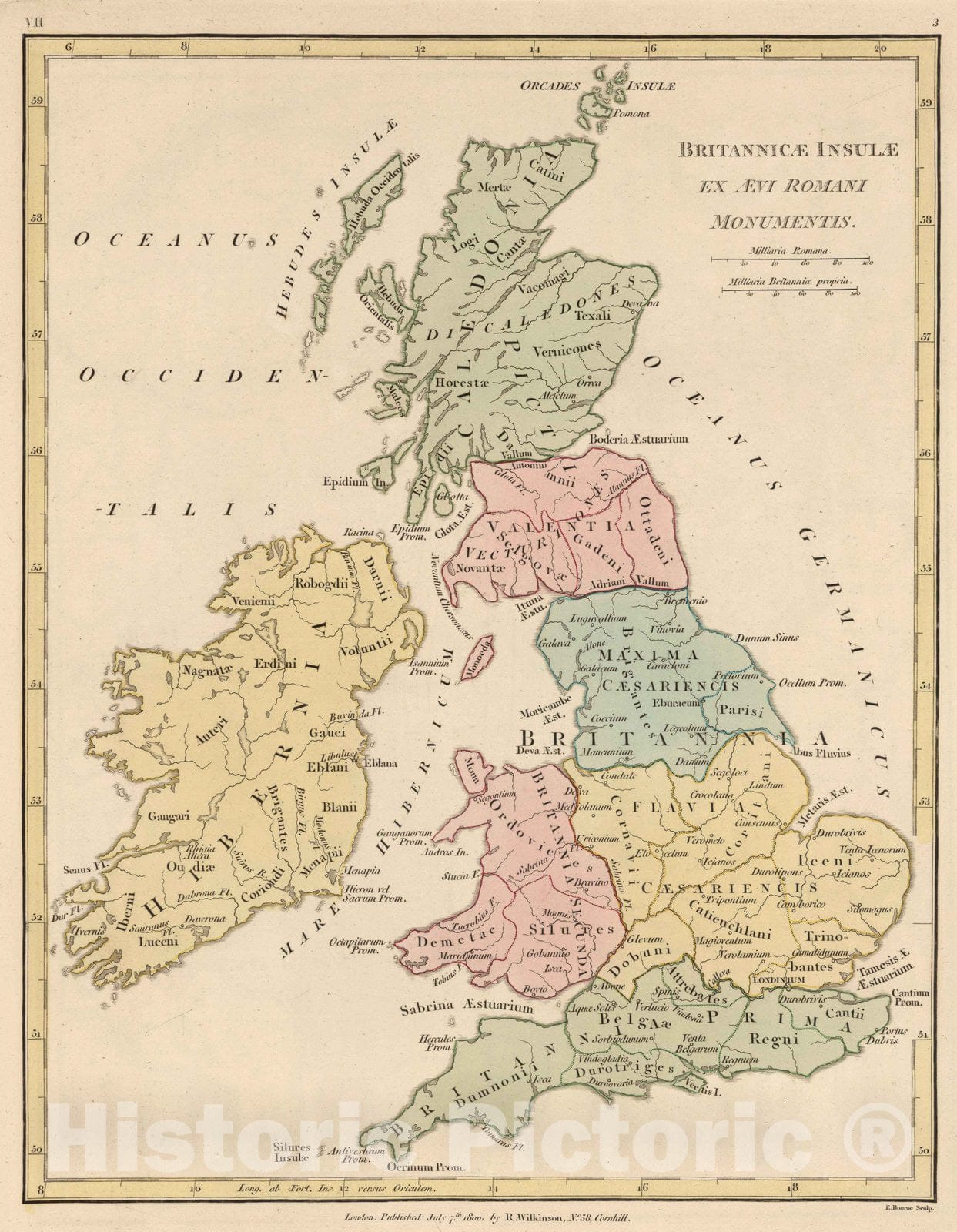Historic Wall Map : Great Britain, British Isles 1800 Britannicae Insulae en Aevi Romani Monumentis. , Vintage Wall Art
